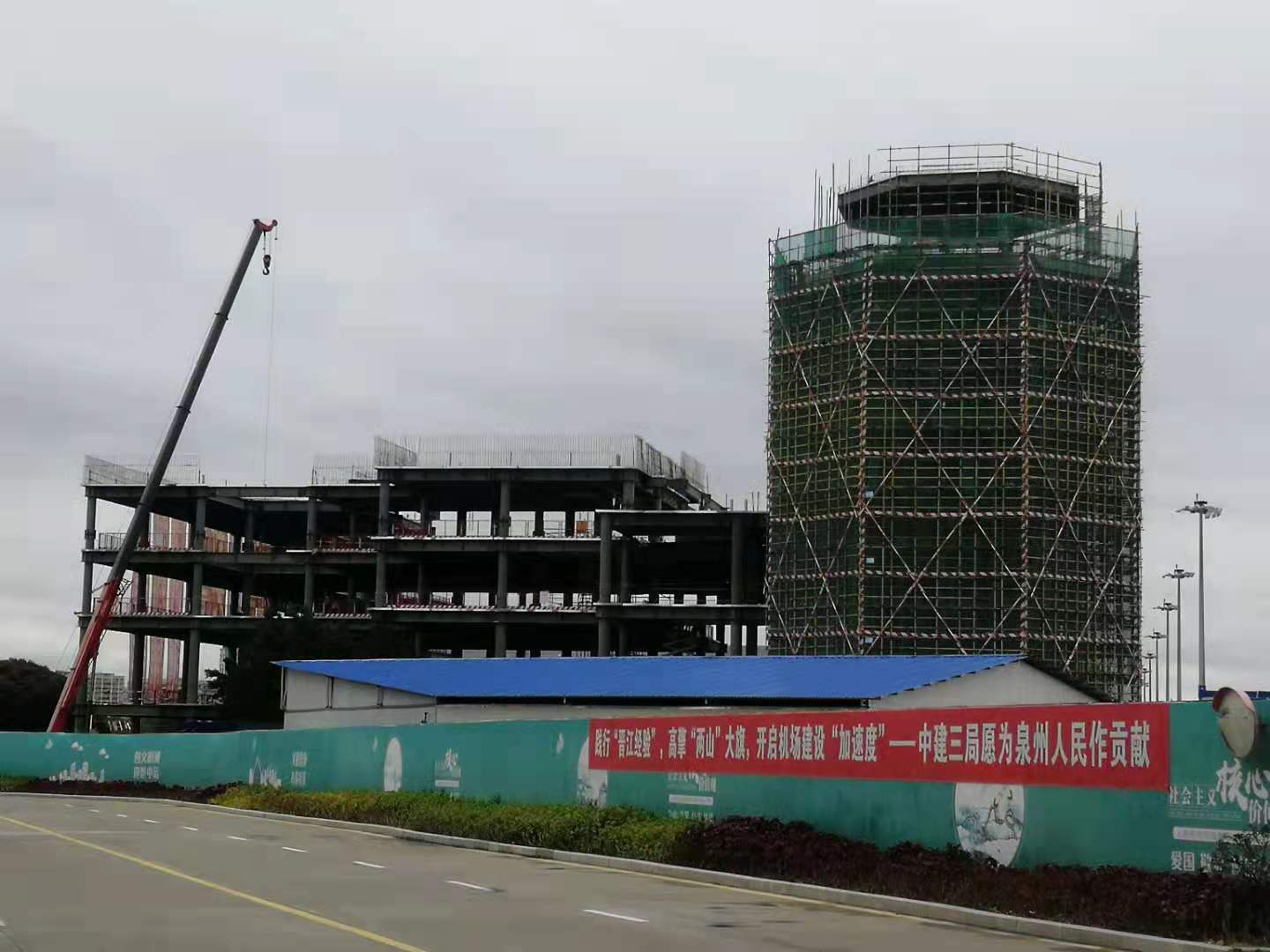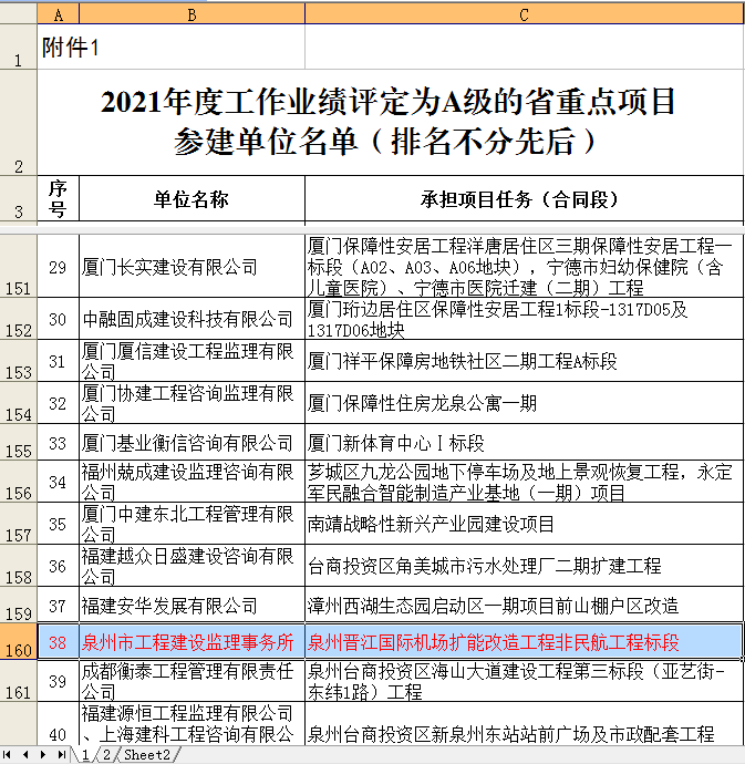 我公司担负监理“泉州晋江国际机场扩能革新工程非民航工程标段”项目,位于泉州市晋江市宁静中路118号泉州晋江国际机场,总建筑面积4.1万㎡。包括扩建海内、国际航站楼,迁建航管楼、空管塔台共2.7万㎡,革新原有航站楼1.2万㎡,新建人防地下室0.18万㎡,更新及新建多套运行系统。目前完成新建塔台8层及扩建海内航站楼一期的主体封顶施工及人防地下室主体施工50%。2022年2月8日,福建省生长和革新委员会评定我公司2021年度事情业绩为“2021年度事情业绩评定为A级的省重点项目参建单位”。